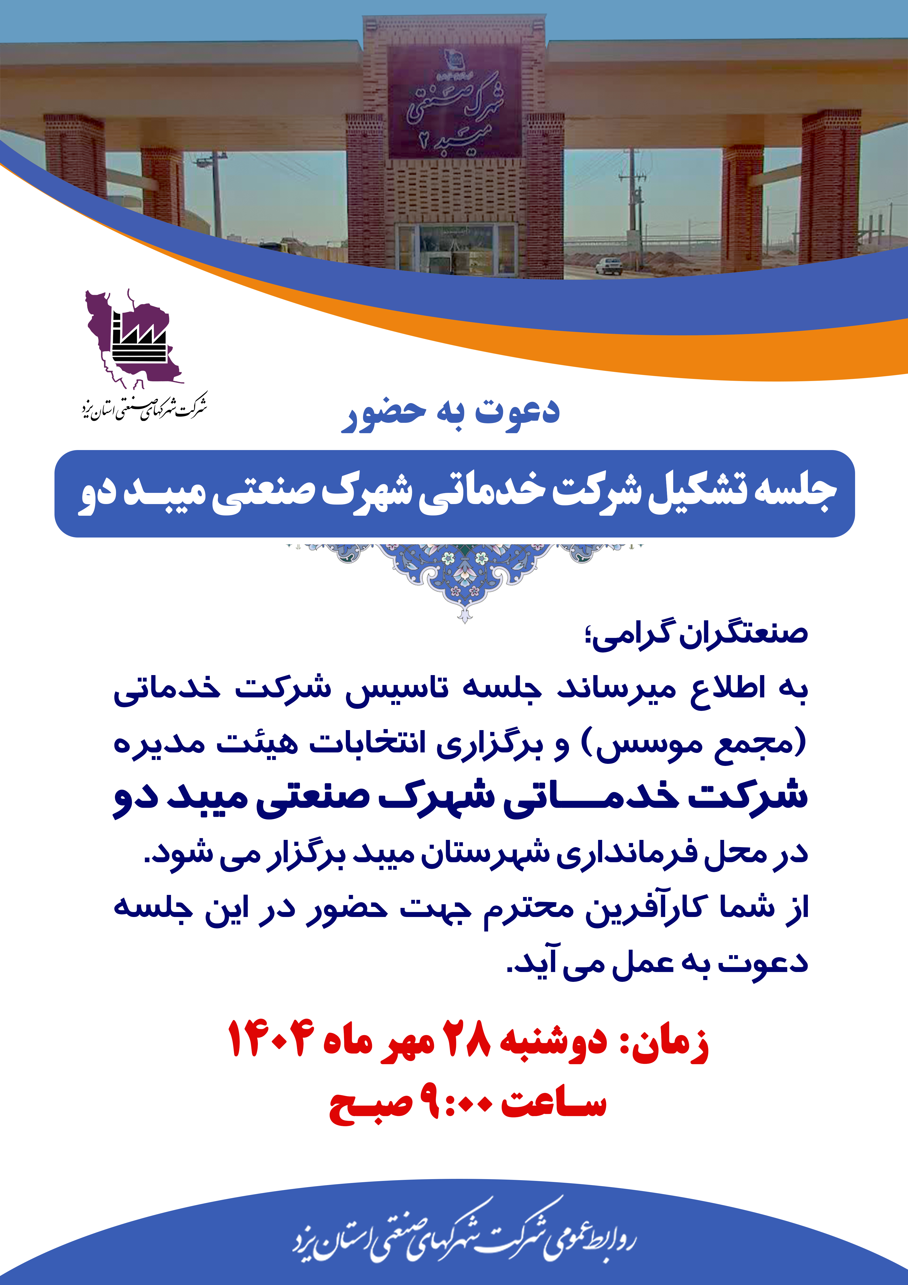 صنعتگران گرامی؛ به اطلاع میرساند جلسه تاسیس شرکت خدماتی (مجمع موسس) و برگزاری انتخابات هیئت مدیره شرکت خدمــاتی شهرک صنعتی میبد دو  در محل فرمانداری شهرستان میبد برگزار می شود.